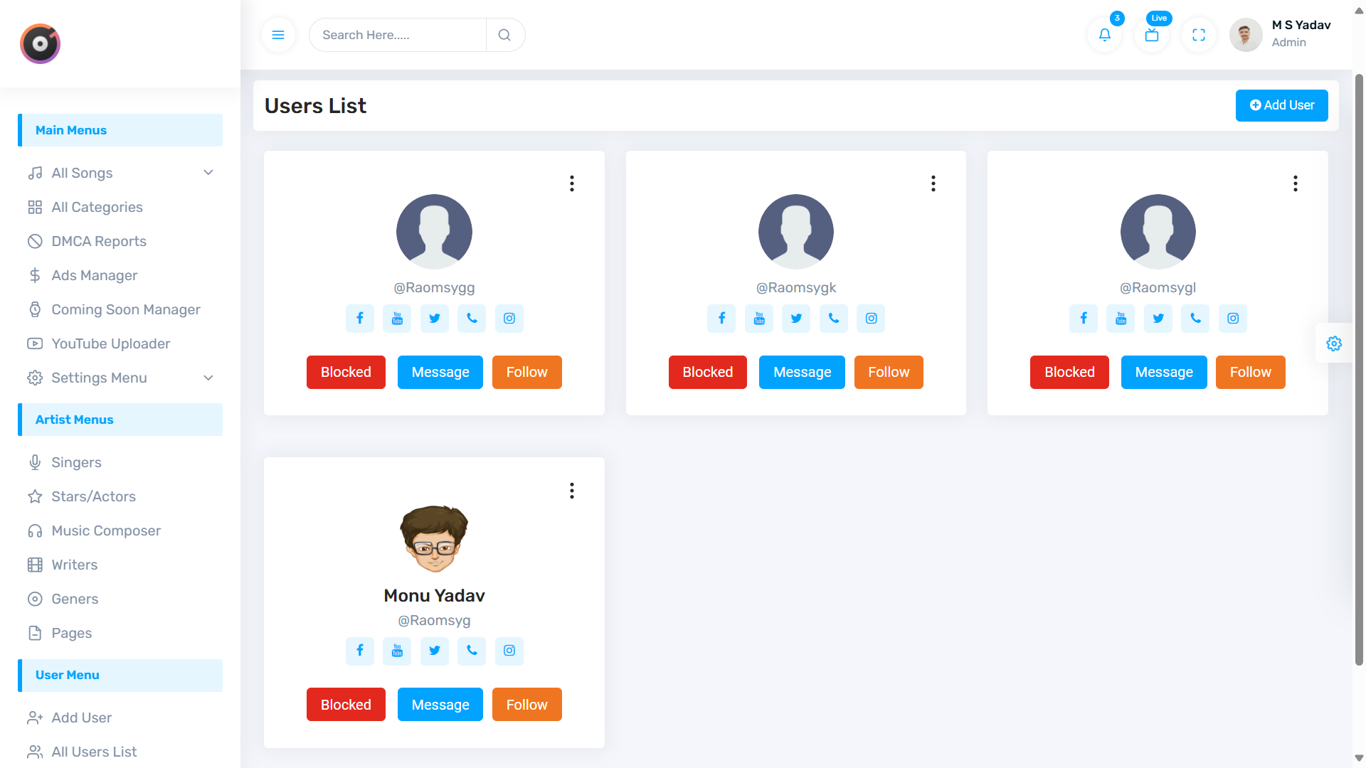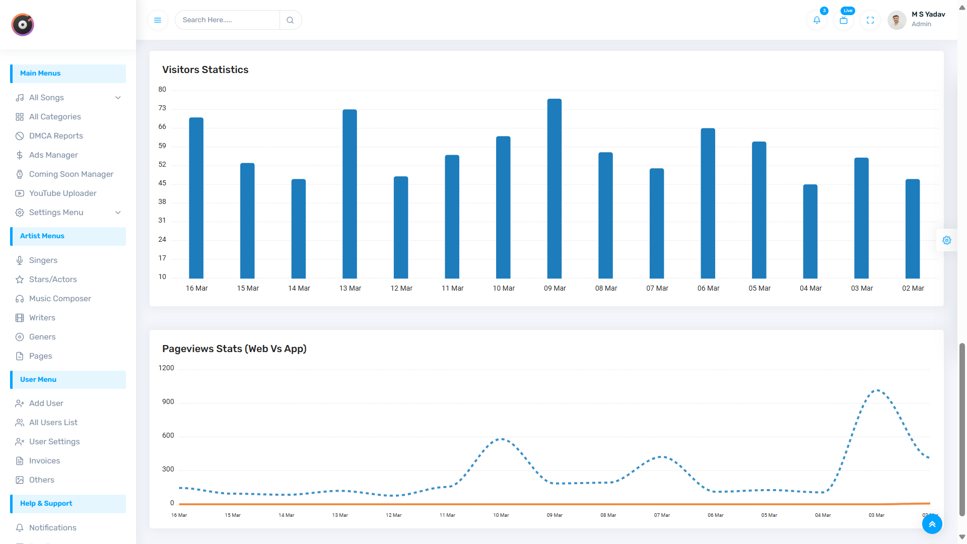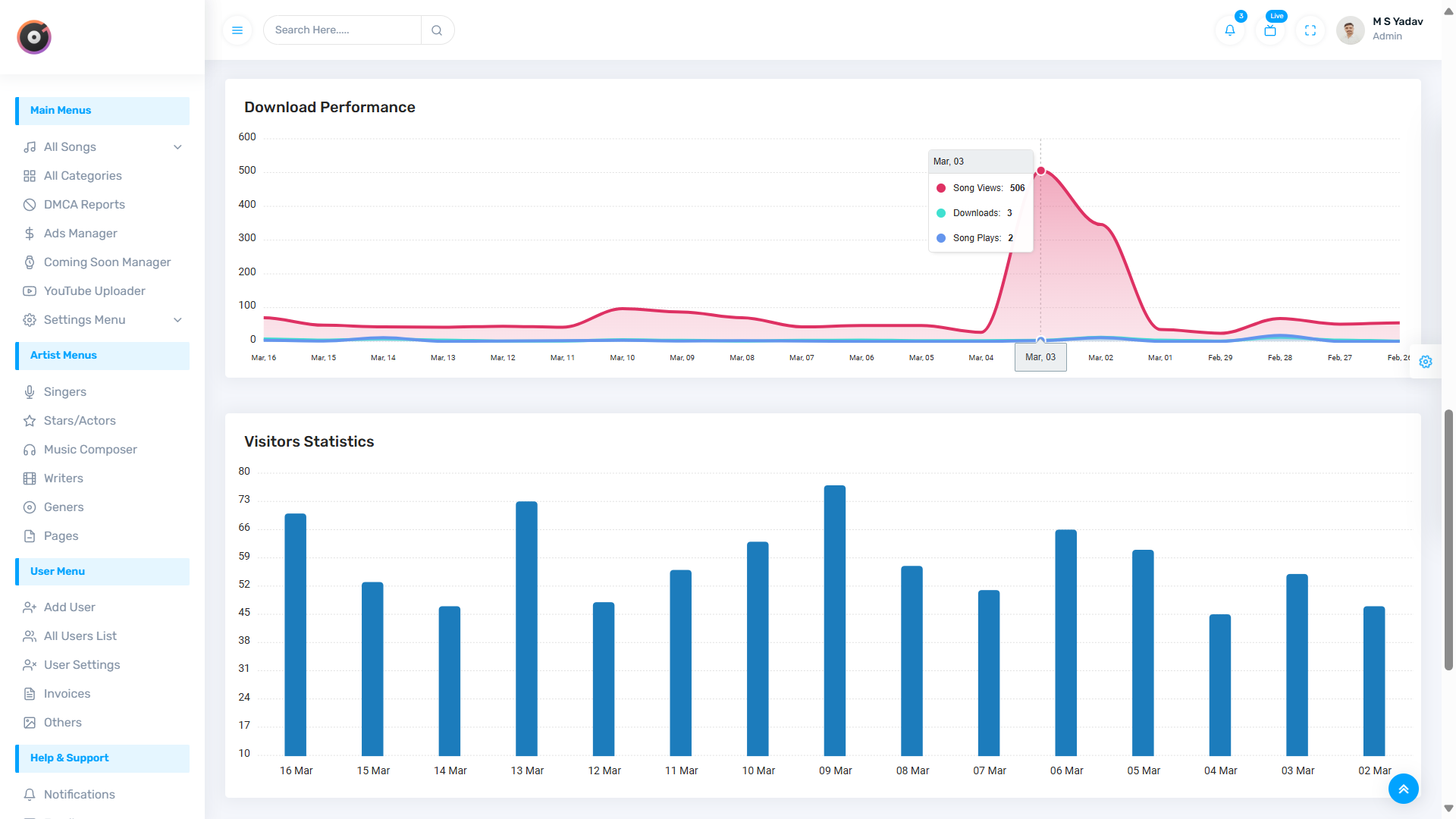 RiyaWebSolutions.Com Music PHP Script is a responsive PHP/Halfmoon Frontend & responsive PHP/Bootstrap admin dashboard script. This PHP Script dashboard and Frontend is comfortable with all devices & all browser like mobile, laptop, tablet, desktop, Mozilla Firefox, chrome, opera, safari.